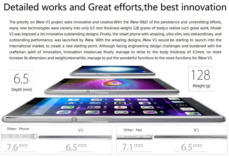 l’iNew V3, si presenta come un nuovo concorrente nella battaglia che si scatenerà a breve sul mercato. Il corpo elegante e le estremità arrotondate ci ricordano vagamente lo Huawei Ascend P6, ma il suo design resta comunque molto originale!
