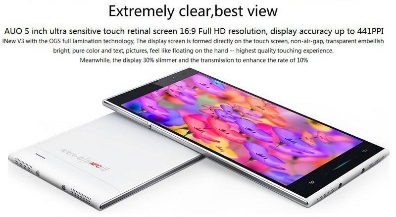 La iNew ha preferito utilizzare un display da 5 pollici con risoluzione HD 720p e un aspect ratio di 16:9. Il display è un pannello OGS (One Solution Glass) con una protezione antigraffio grazie al Corning Gorilla Glass 2.